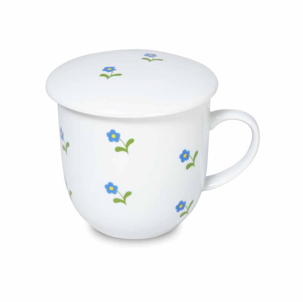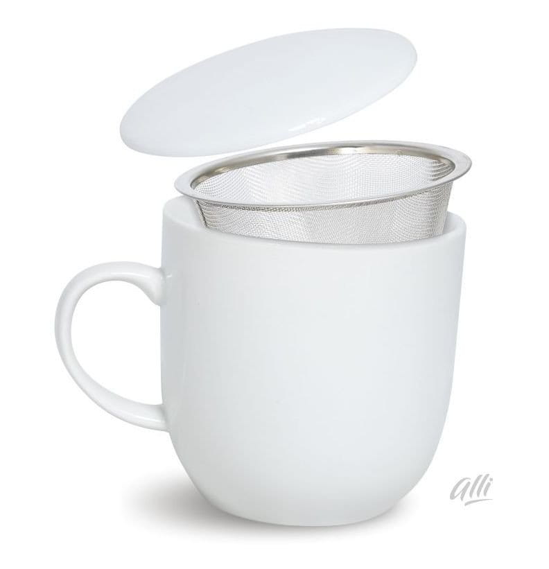 Kubek porcelanowy z porcelanową przykrywką i metalowym sitkiem-zaparzaczem. Pojemność 360 ml, wysokość 85 mm, średnica 90/55 mm. Dzięki przykrywce i zaparzaczowi jest idealny do przygotowywania herbat liściastych oraz naparów na bazie mieszanki ziół i roślin.
