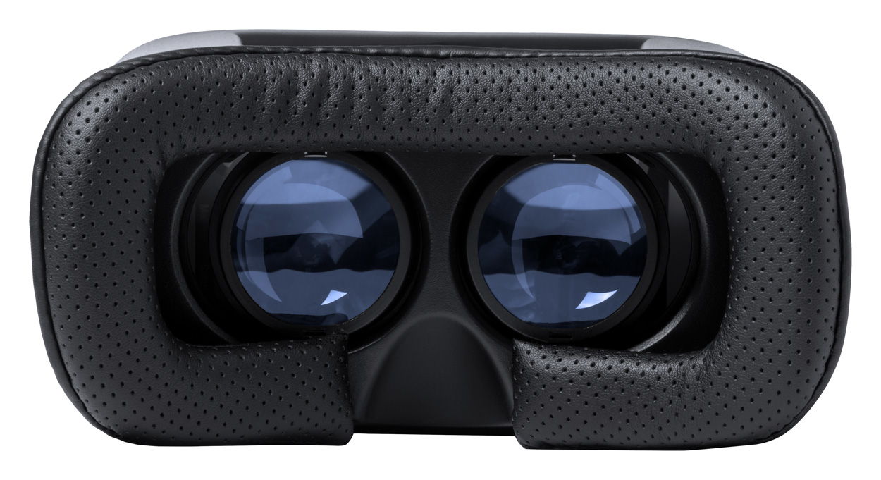 Plastikowa gogle wirtualnej rzeczywistości z regulowanymi soczewkami, elastycznym paskiem i uniwersalnym uchwytem na telefon.