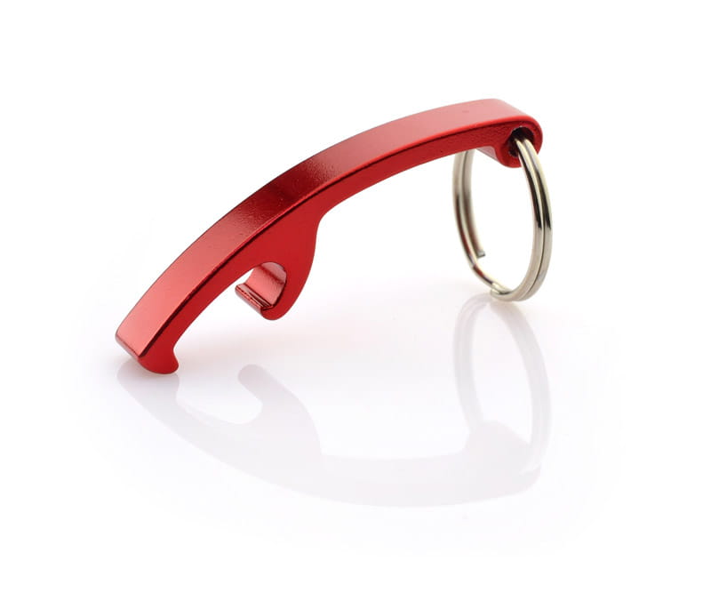 Aluminiowy brelok do kluczy z funkcją otwieracza, dostępny w pięciu kolorach. Pakowany w woreczek foliowy.