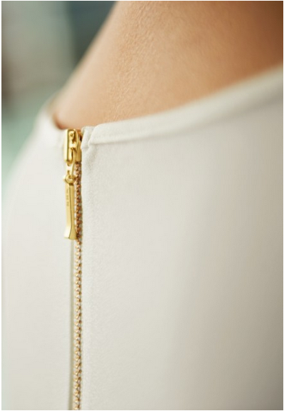 o kolorze białym z krótkim rękawem, okrągłym dekoltem, przednią zakładką zaszywaną na piersiach, tylni zamek ze złotymi detalami.