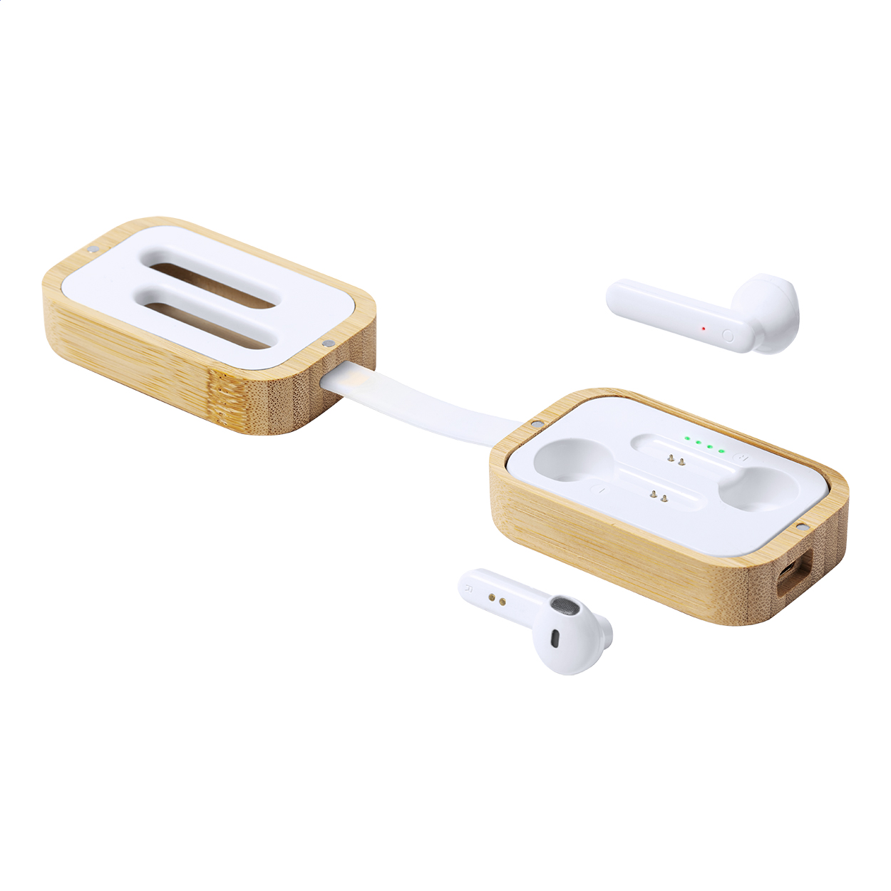 Bezprzewodowe słuchawki stereo (TWS) z funkcją zestawu głośnomówiącego w bambusowym etui z ładowarką. W zestawie kabel USB do ładowania.