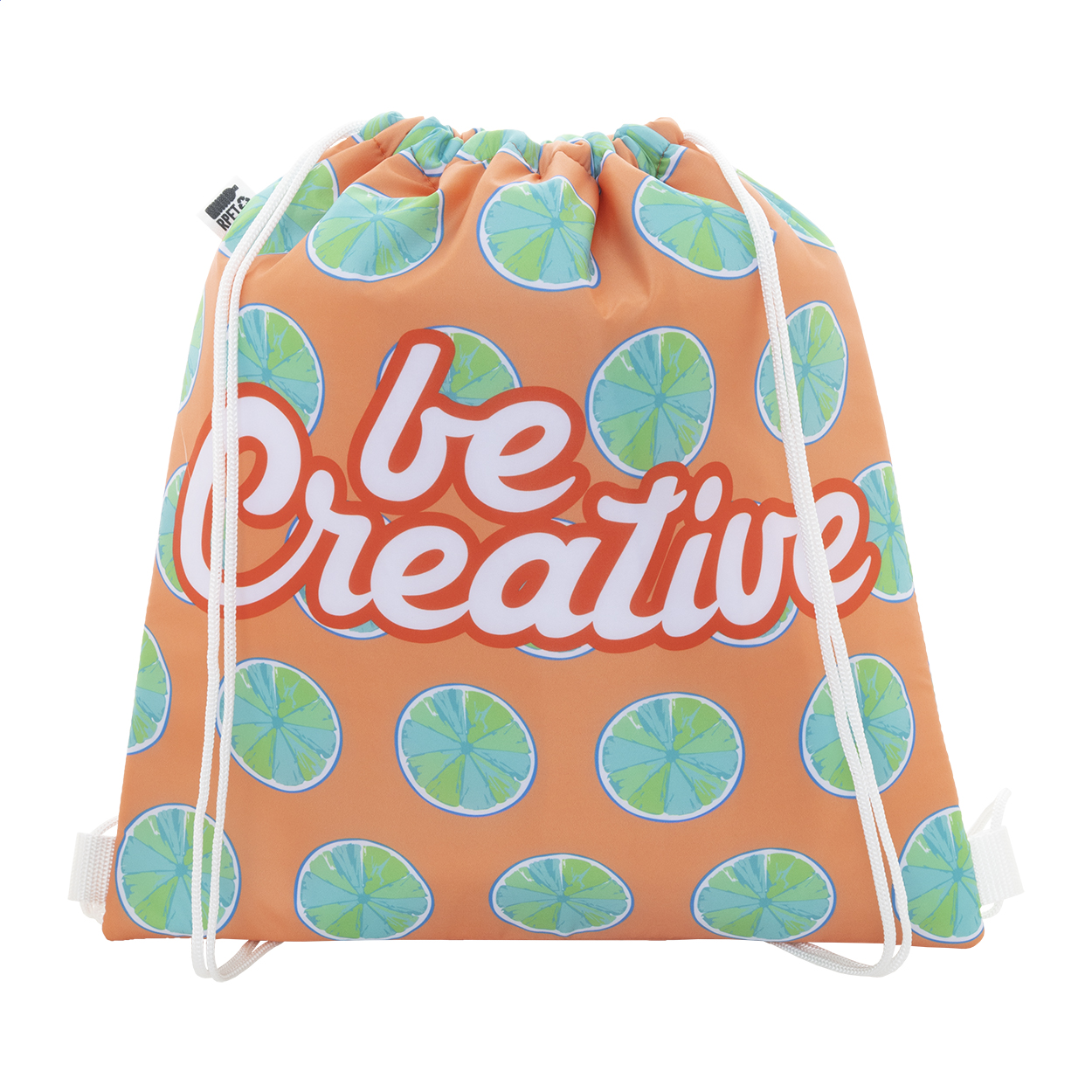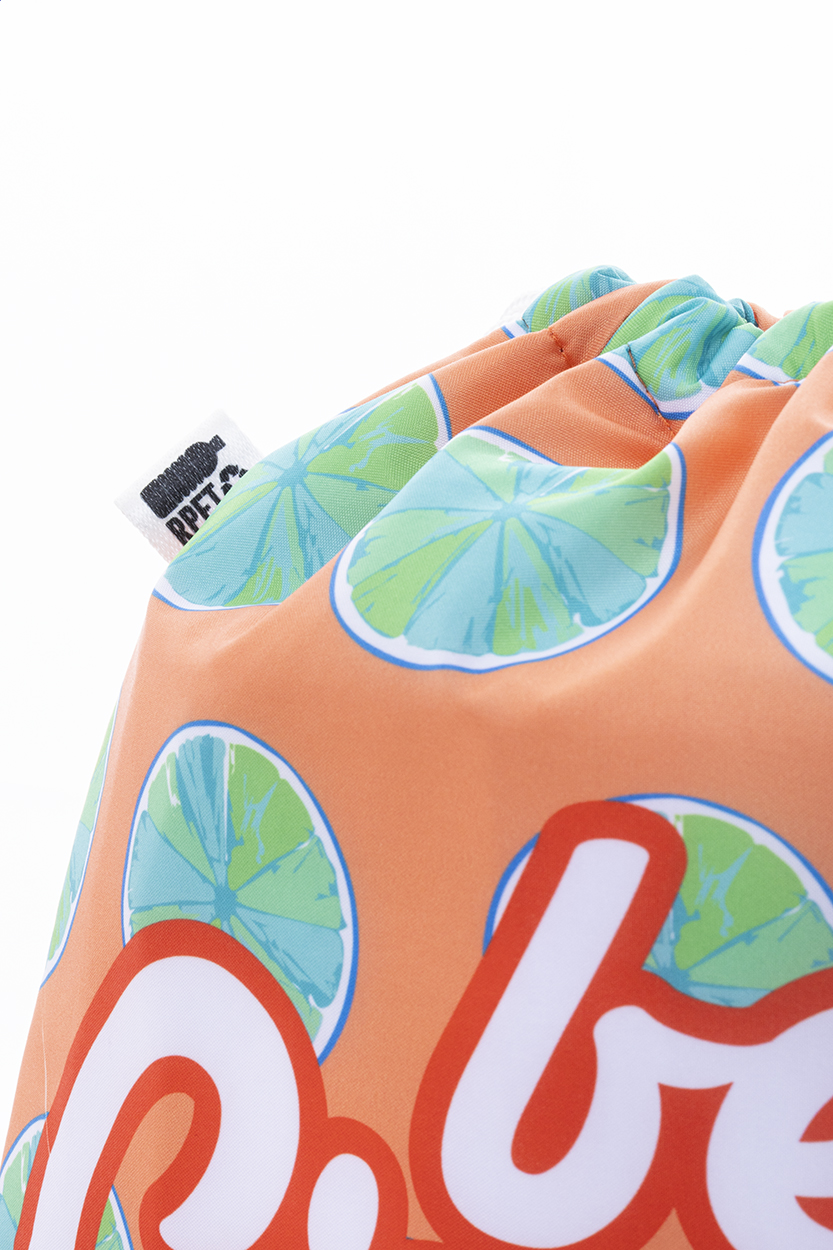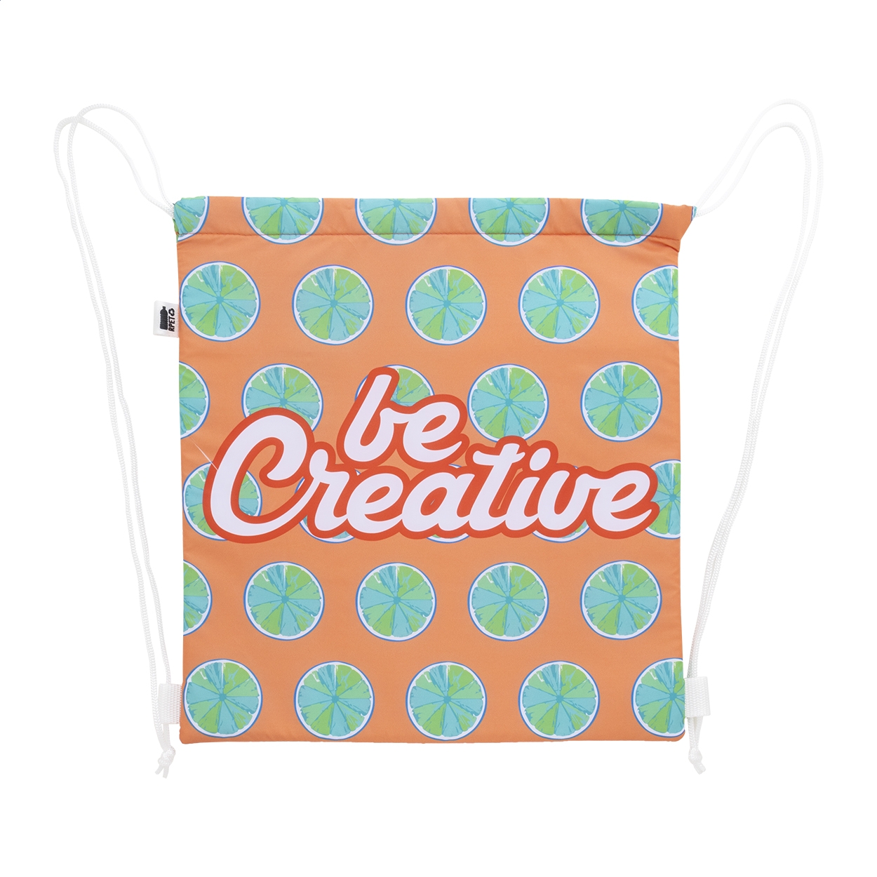 Produkt można w pełni spersonalizować – cała powierzchnia worka jest przeznaczona do nadruku sublimacyjnego, co pozwala na dowolne oznakowanie lub stworzenie własnego wzoru. Worek zamykany jest za pomocą praktycznego ściągacza, a charakterystyczna metka RPET podkreśla ekologiczny charakter materiału.