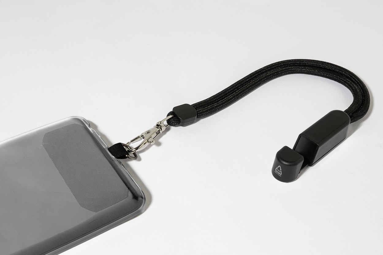 Funkcjonalna opaska na nadgarstek wykonana z ekologicznego materiału RPET, wyposażona w wkładkę na telefon komórkowy. Dodatkowo posiada zintegrowaną podstawkę biurkową wykonaną z recyklingowanego ABS, umożliwiającą wygodne ustawienie urządzenia podczas pracy, oglądania treści lub wideorozmów. Praktyczne i wielofunkcyjne rozwiązanie do codziennego użytku w ruchu i w biurze.