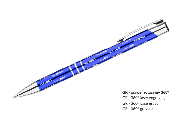 Długopis automatyczny z 3 ringami i niebieskim wkładem. Logo grawerujemy na powierzchni długopisu.