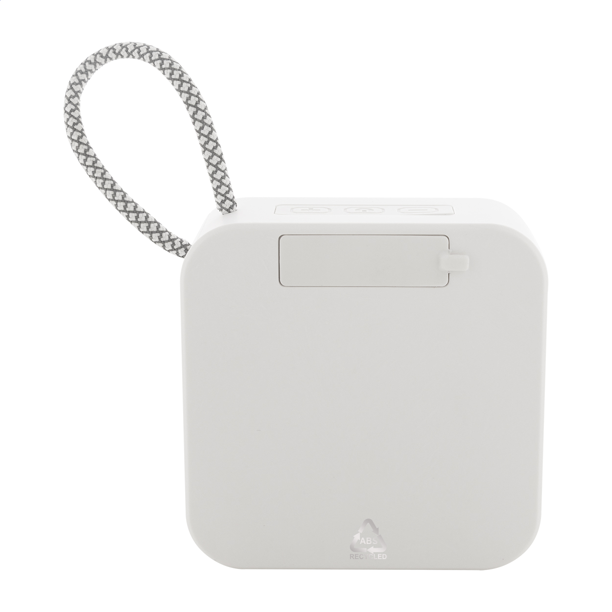 Bezprzewodowy głośnik wykonany z recyklingowanego tworzywa ABS (RABS), wyposażony w metalową siateczkę oraz praktyczny pasek do noszenia. Posiada wbudowany akumulator o pojemności 300 mAh, zapewniający mobilne użytkowanie. Urządzenie obsługuje odtwarzanie plików MP3 z karty micro SD, co zwiększa jego funkcjonalność. W zestawie znajduje się kabel USB do ładowania. Kompaktowy i wygodny głośnik do codziennego użytku