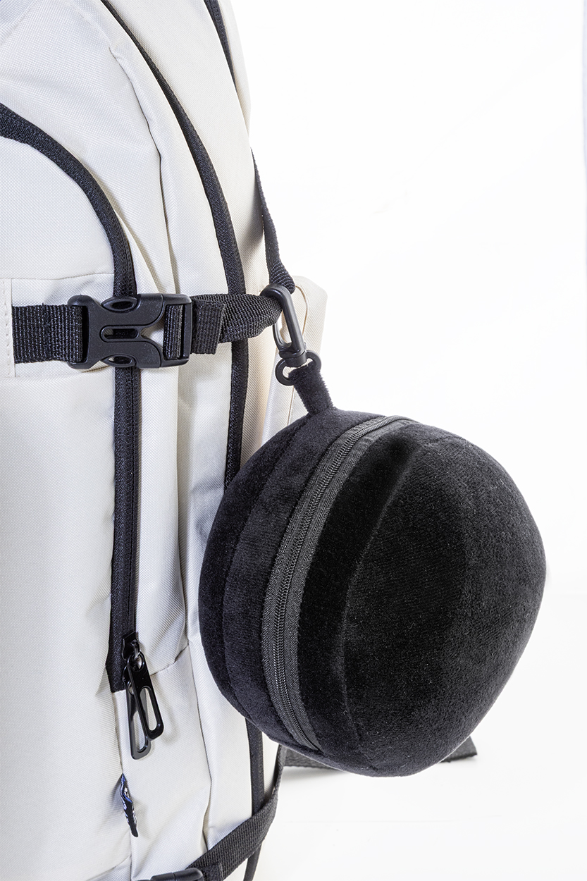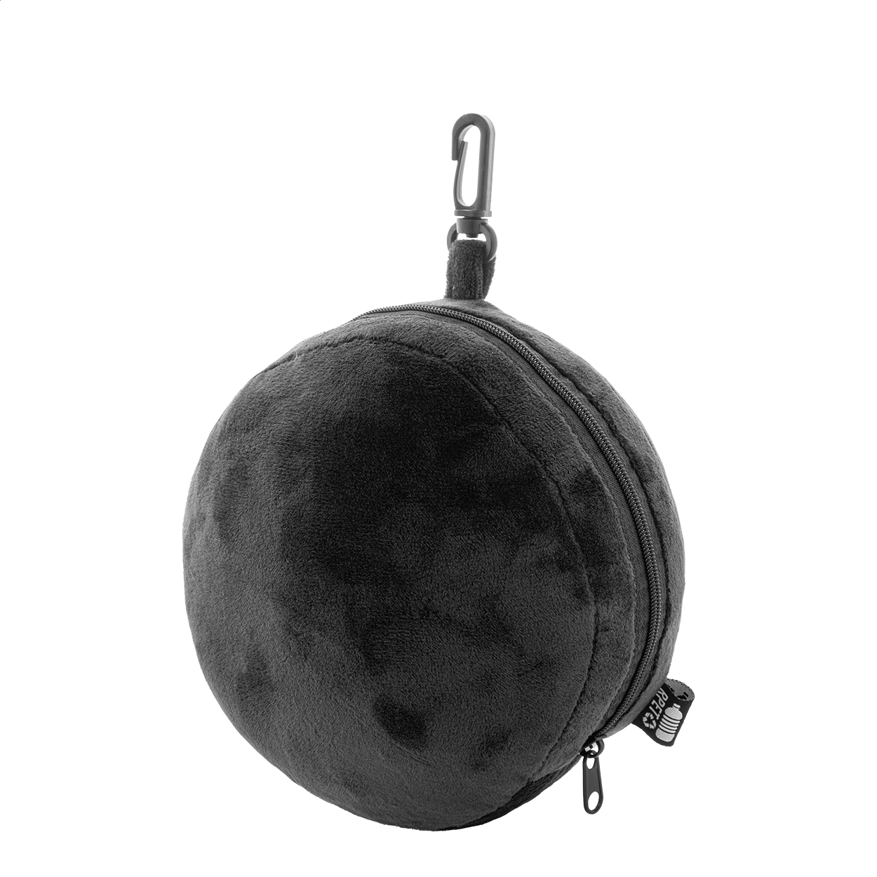 Poduszka podróżna z poliestru RPET ze zintegrowaną maską na oczy i elastycznymi paskami. Zapinana na suwak, tworzy kompaktową kulę, co ułatwia przechowywanie. W zestawie karabińczyk PP do przymocowania do bagażu. Z charakterystyczną etykietą RPET.