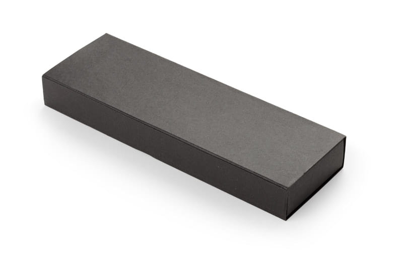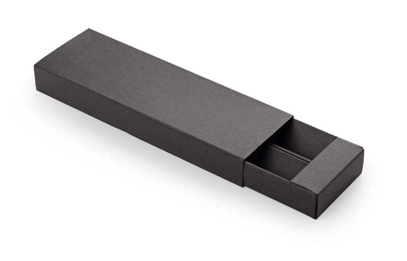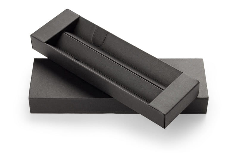 Gustowne etui na dwa artykuły piśmiennicze wykonany z czarnej tektury. Pasuje do długopisów o wysokości do 143 mm i średnicy do 12 mm.