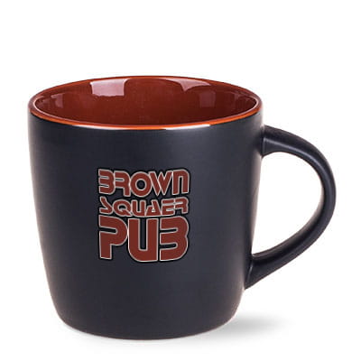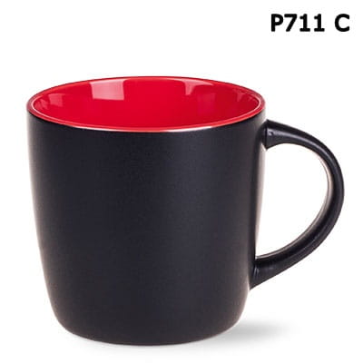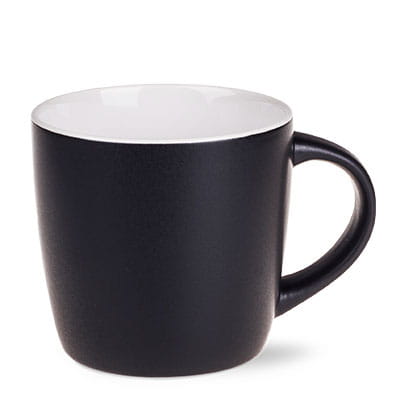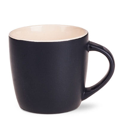 Bardzo popularny kubek reklamowy o klasycznym obłym kształcie oraz nowoczesnym, matowym szkliwieniu. Błyszczące, kolorowe wnętrze doskonale kontrastuje z czarną satynową powierzchnią na zewnątrz. Kubek dostępny w bardzo wielu wersjach kolorystycznych.