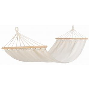 Hamak płócienny SNOOZY z drewnianymi poprzeczkami (maksymalny udźwig do około 120 kg), w materiałowym pokrowcu ze ściągaczem.