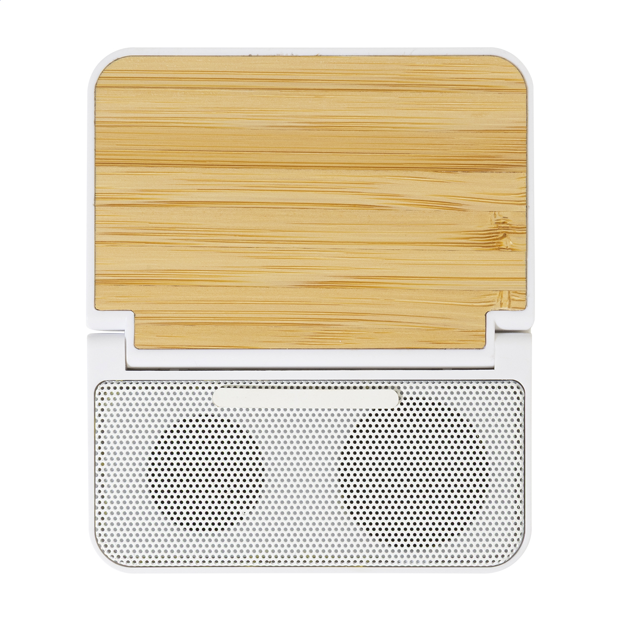 Głośnik bezprzewodowy z recyklingowanego ABS z uchwytem na telefon pokrytym bambusem i wbudowaną szybką ładowarką bezprzewodową (15 W). Z wbudowanym akumulatorem (1200 mAh). W zestawie kabel USB do ładowania.