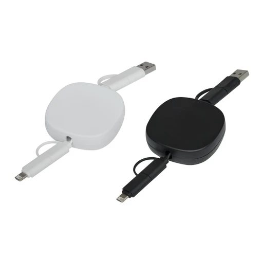 Kabel do ładowania i przesyłania danych TRANSFER SQUARE. Do zasilania urządzeń elektronicznych, w tym laptopów (moc 65W). Zwijany kabel ma długość ok. 92 cm. Posiada łączoną wtyczkę wejściową USB-A/USB-C oraz łączoną wtyczkę wyjściową USB-C/Micro USB/Lightning.