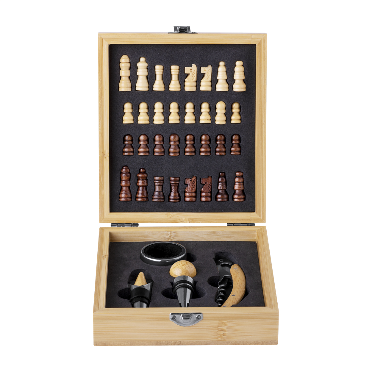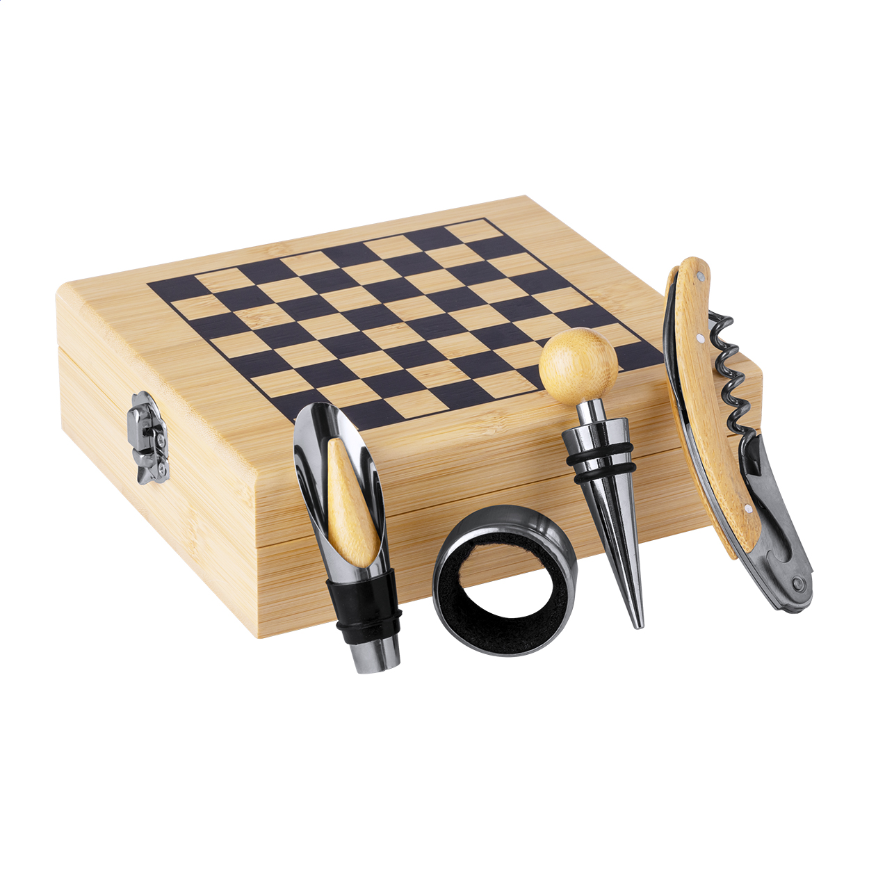 Wykonany ze stali nierdzewnej zestaw do wina składa się z 4 elementów: korkociągu, korka, dyszy i zatyczki, umieszczonych w bambusowym pudełku, które pełni również funkcję eleganckiej szachownicy. Zestaw zawiera 32 figury szachowe, umożliwiając rozgrywkę od razu po rozpakowaniu.