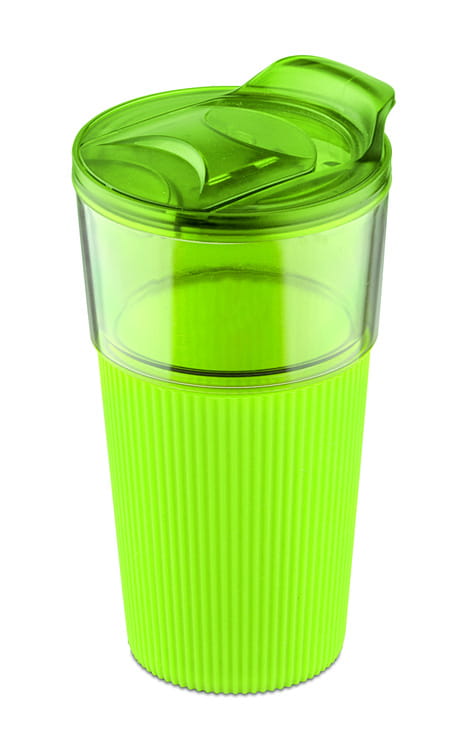 Stylowy kubek o pojemności 400 ml. Kubek wykonany jest w całości z tworzywa. Posiada silikonową opaskę, która stanowi dno antypoślizgowe, zapewniając wygodne trzymanie oraz zapobiega nadmiernemu nagrzewaniu się kubka. Znakowanie możliwe na korpusie kubka.