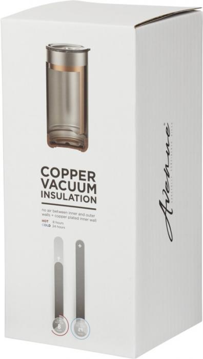 Dwuścienna próżniowa konstrukcja ze stali nierdzewnej, miedziana powłoka. Kubek ten utrzymuje temperaturę zimnych napojów do 24 godzin, a gorących co najmniej 8 godzin. Konstrukcja ścianek zapobiega kondensacji na zewnątrz. Pojemność wynosi 500 ml. Zapakowany w pudełko upominkowe Avenue. Stal nierdzewna.