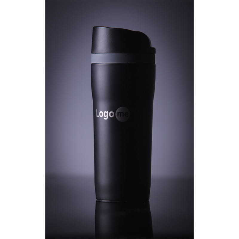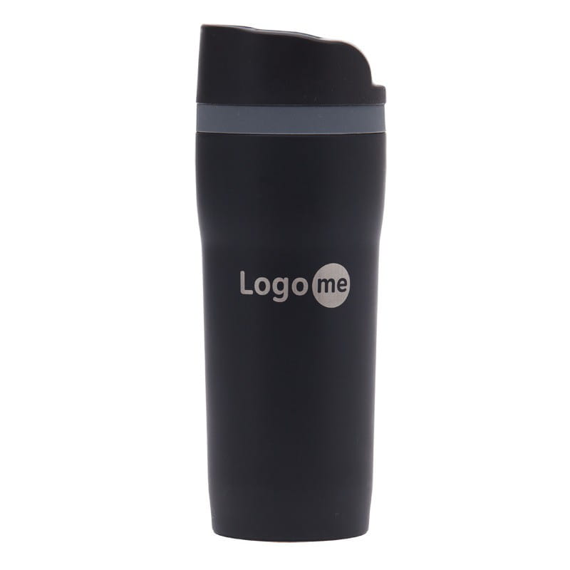 Szczelny kubek izotermiczny o pojemności 350 ml. Dwie ścianki ze stali nierdzewnej, wewnątrz stal 18/8 o podwyższonej jakości. Próżnia pomiędzy ściankami zapewnia bardzo dobre właściwości termoizolacyjne. Funkcjonalny przycisk open/close. Pokrywkę kubka można rozkręcić, co pozwala na staranne umycie kubka. Podstawa kubka z wodoodpornej gumy termoplastycznej TPR. Pakowany w białe kartonowe opakowanie. Możliwość dobrania dodatkowej opaski R00001.