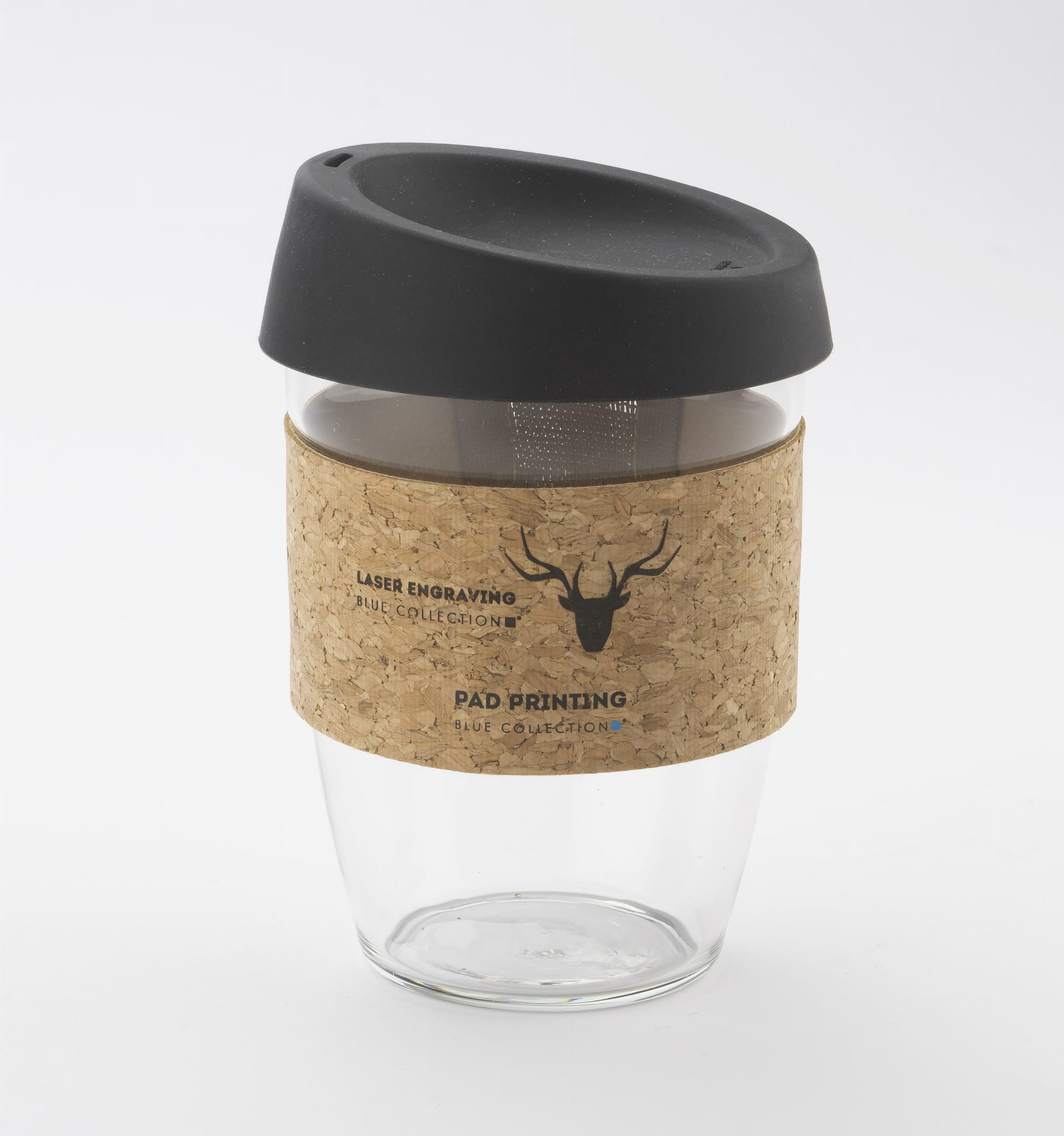 Kubek z borokrzemowego szkła z korkowym uchwytem i sylikonowym wieczkiem