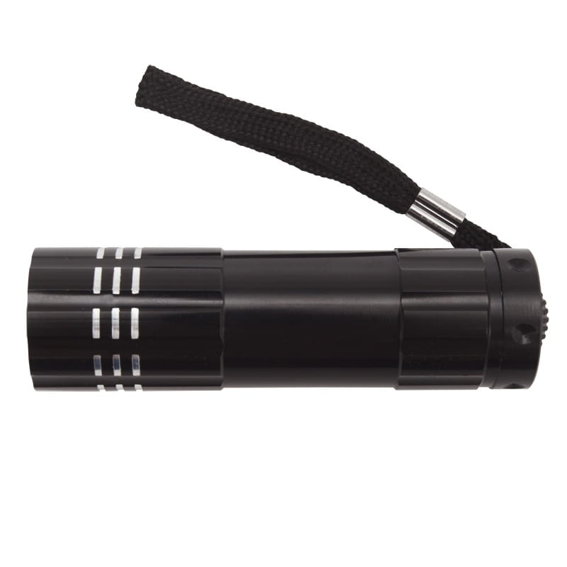 9 diodowa latarka LED wykonana z aluminium. Zasilana 3 bateriami AAA (w cenie produktu). Pakowana w czarne kartonowe pudełko.