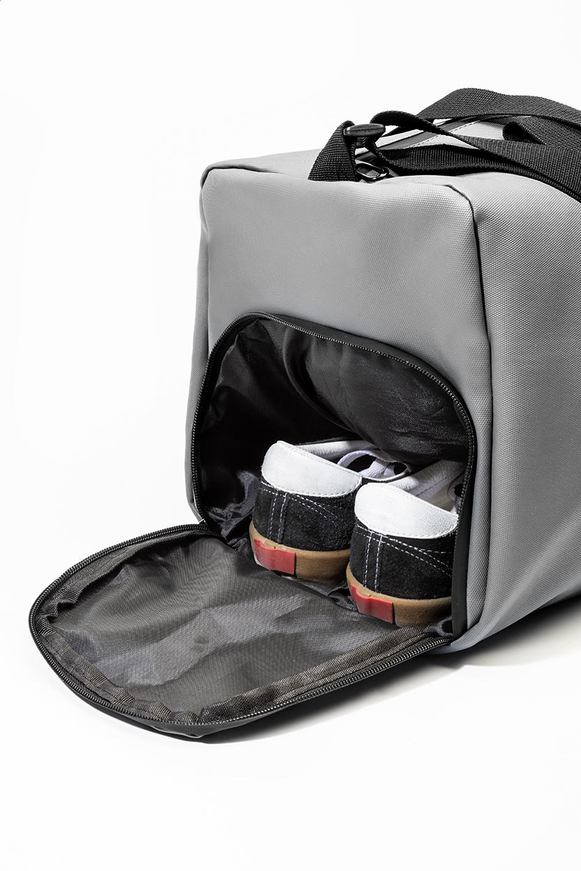 Wodoodporna torba sportowa z materiału RPET z główną komorą zapinaną na zamek, przednią kieszenią zapinaną na zamek, przegrodą na buty zapinaną na zamek i regulowanym paskiem na ramię. Wykonana z poliestru 600D RPET powlekanego poliuretanem, z charakterystyczną metką RPET.