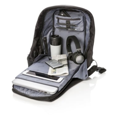 miękka przegroda na laptopa 15", wewnątrz kieszeń na portfel i paszport z ochroną RFID, otwarcie z tyłu plecaka, gniazdo USB do ładowania telefonów (power-bank nie jest dołączony), ukryta tylna kieszeń z łatwym dostępem