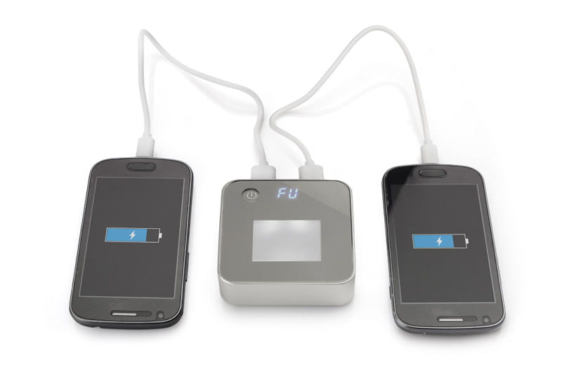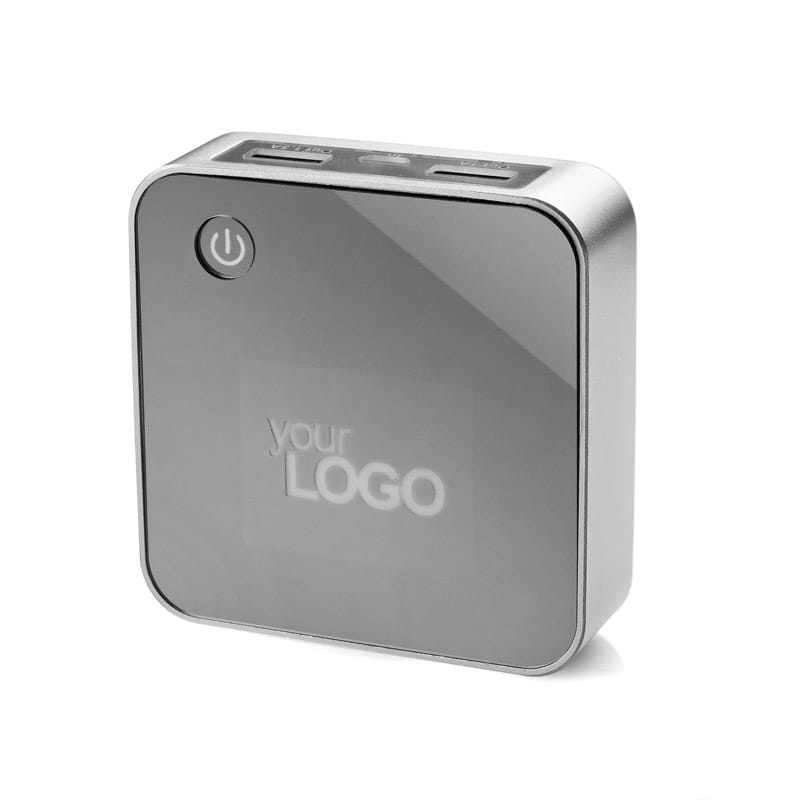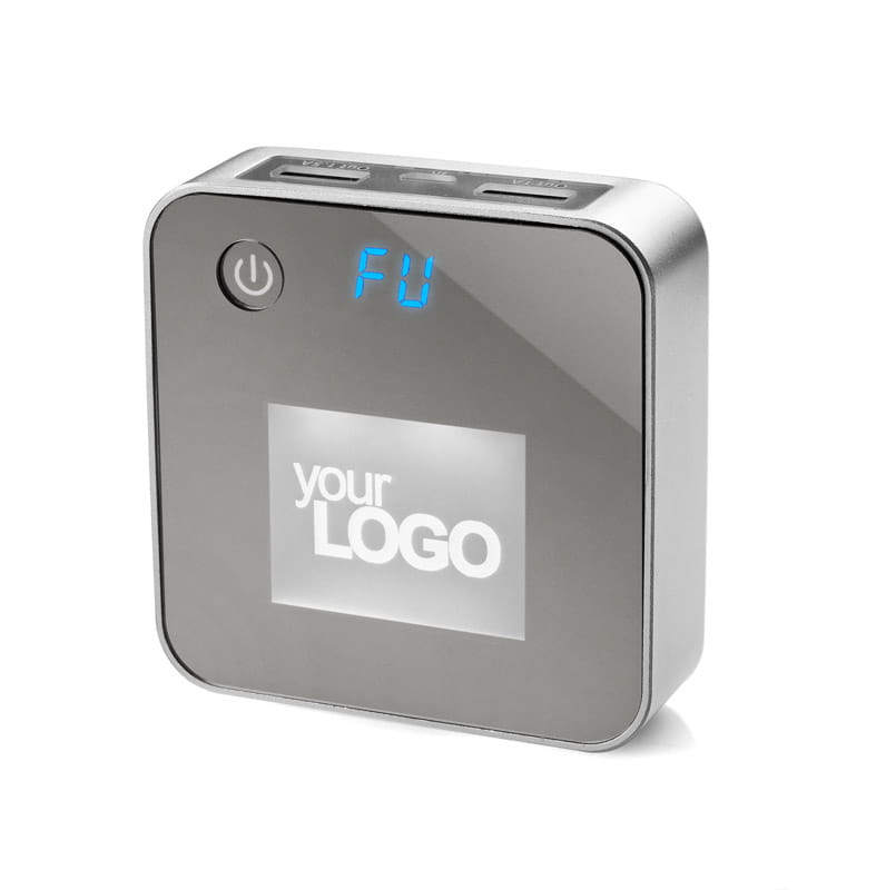 Power bank LUMINI to zewnętrzny akumulator do ładowania urządzeń mobilnych o dużej pojemności 6600 mAh. Ramka obudowy wykonana jest z metalu, a front z podświetlanego od spodu tworzywa. Daje to możliwość wygrawerowania logo, które po naciśnięciu przycisku zostanie podświetlone. Wyświetlacz pokazuje dokładną ilość energii (00-99), jaka pozostała w power banku. 2 wyjścia USB pozwalają na ładowanie dwóch urządzeń jednocześnie.