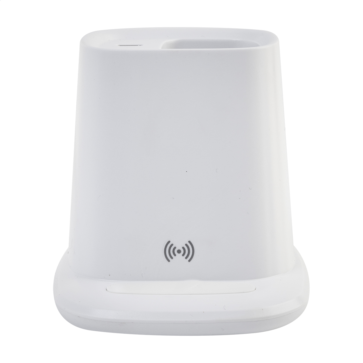 Wielofunkcyjny organizer na biurko wykonany z recyklingowanego tworzywa ABS, który łączy praktyczne przechowywanie z nowoczesnymi rozwiązaniami technologicznymi. Wyposażony w uchwyt na długopisy oraz wygodny stojak na telefon, pozwala utrzymać porządek i mieć najważniejsze akcesoria zawsze pod ręką.
