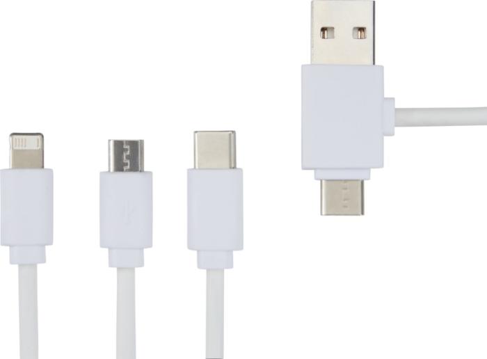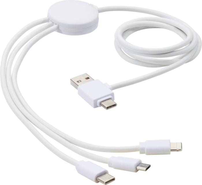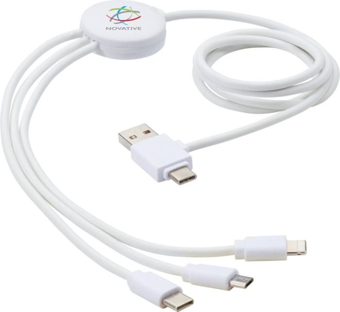 Kabel ładujący z dodatkiem antybakteryjnym i 5 różnymi złączami: Wejście: USB typu C i typu A, wyjście: typu C, iOS oraz micro USB. Pozwala to na używanie kabla również z urządzeniami z wyjściem typu C, które znajdują się w nowszych generacjach telefonów i MacBooków. Długość przewodu wynosi 100 cm. Dodatek antybakteryjny jest w stanie skutecznie obniżyć poziom bakterii obecnych na powierzchni materiału, z wysoką skutecznością hamuje on rozwój bakterii i grzybów odpowiedzialnych za powstawanie nieprzyjemnych zapachów, plam i degradacji wyrobów tekstylnych i plastikowych. Sprawdzona zgodnie z normą ISO 20743:2013. PVC, Plastik ABS.