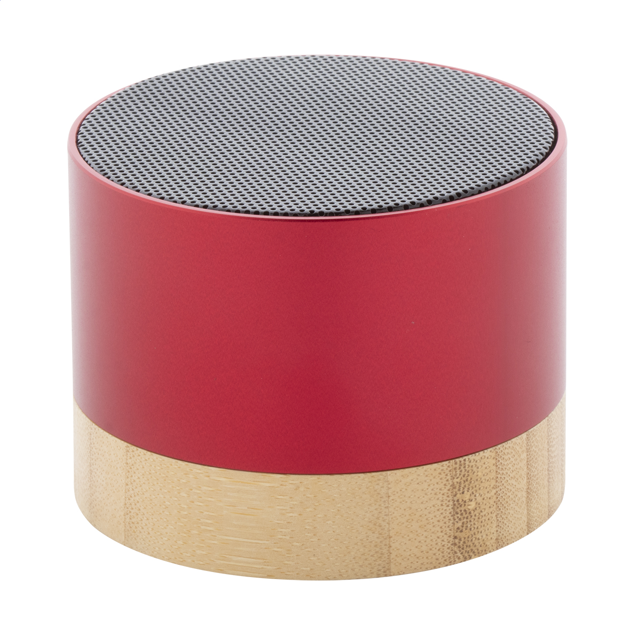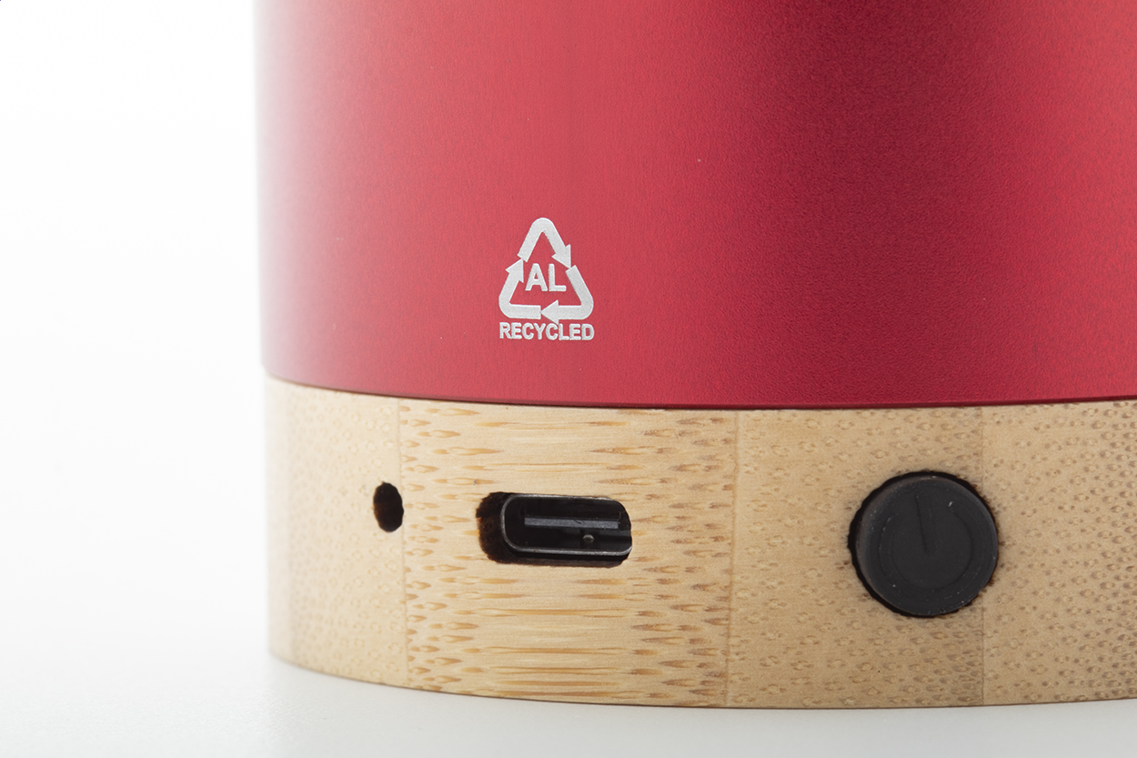 Bezprzewodowy głośnik z aluminium pochodzącego z recyklingu i bambusową podstawą. Z funkcją głośnomówiącą i wbudowanym akumulatorem. W zestawie kabel USB do ładowania.