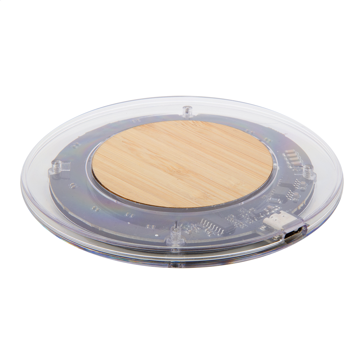 Szybka ładowarka indukcyjna o mocy 15 W to nowoczesne i stylowe urządzenie łączące funkcjonalność z wyjątkowym designem. Przezroczysta obudowa z plastiku i bambusa z widocznymi elementami elektronicznymi nadaje jej technologiczny, futurystyczny charakter.