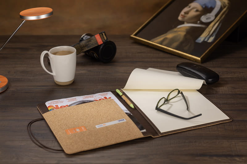 Korkowa teczka A4 z notatnikiem to elegancki i funkcjonalny akcesorium biurowy. Teczka wykonana jest z wysokiej jakości korka, zapewnia nie tylko estetyczny wygląd, ale również trwałość i ekologiczny charakter. Główna kieszeń o dużym rozmiarze pozwala na bezpieczne przechowywanie ważnych papierów czy nawet tabletu. Dodatkowo, dwie mniejsze kieszonki umożliwiają uporządkowane przechowywanie kartek, wizytówek czy drobnych akcesoriów biurowych. Wewnątrz teczki znajduje się również dedykowane miejsce na długopis, co ułatwia szybkie notowanie ważnych informacji czy podpisywanie dokumentów. Zamykanie teczki odbywa się za pomocą elastycznej gumki z metalowym elementem. Dodatkową zaletą tej teczki jest jej opakowanie - woreczek non woven, który chroni ją przed zabrudzeniami i uszkodzeniami podczas transportu czy przechowywania