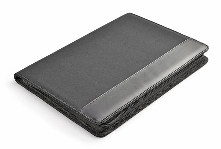Teczka zapinana na zamek, wykonana z mikrofibry i poliestru 600D. Zawiera dużą kieszeń, kieszeń zapinaną na zamek, 2 miejsca do wpięcia USB, małe kieszonki, miejsce na długopis, notes. Notes nie jest umocowany na stałe, ale wsuwany w kieszonkę, dzięki czemu można go łatwo wymienić. Logo wygrawerujemy na teczce.