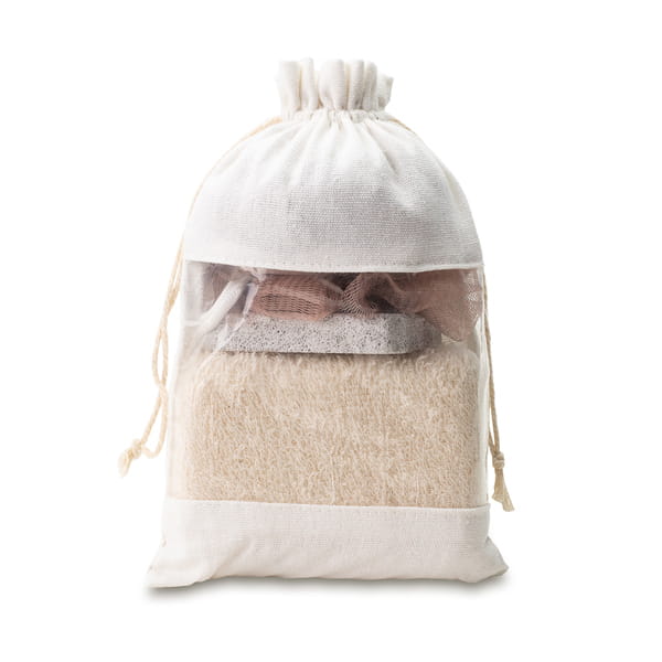 Zestaw do kąpieli składający się z gąbki, pumeksu oraz myjki, zapakowany w bawełniany woreczek z okienkiem.