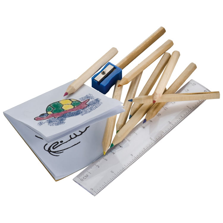 Świetny zwłaszcza dla najmłodszego pokolenia. Z tym zestawem najmłodsi mogą podjąć pierwsze kroki w malowaniu pobudzając swój rozwój motoryczny. Zestaw do malowania zawiera 10 kredek, plastikową linijkę (15cm), plastikową temperówkę i różne motywy obrazkowe do rysowania. Nadruk możemy umieścić na spodzie kartonika. Grupa nadruku: T3.