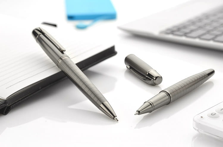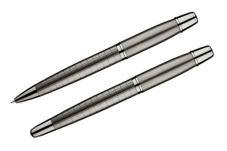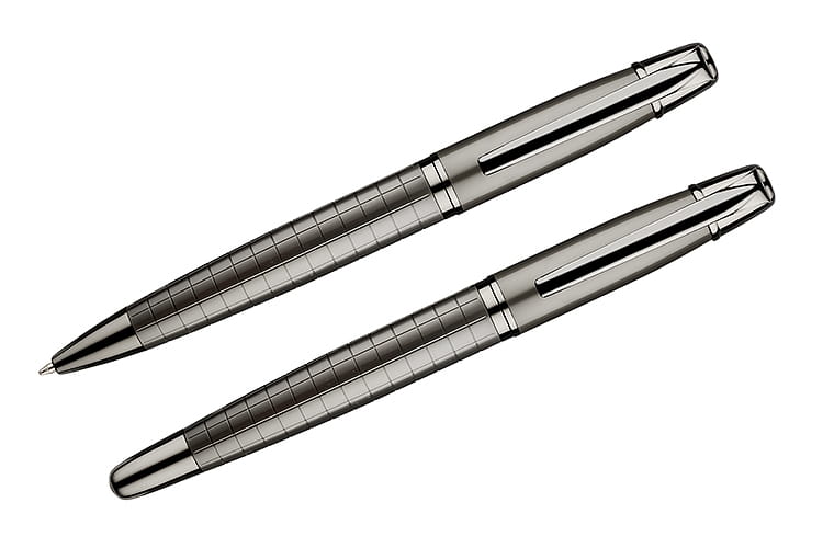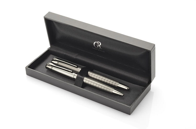 W eleganckim czarnym pudełku znajdują się dwa doskonałe akcesoria: długopis oraz pióro kulkowe, oba w stylowym grafitowym kolorze. Każdy z elementów zestawu został wykonany w całości z metalu, co nadaje im trwałość, a także wyrafinowany charakter. Dolna część zarówno długopisu, jak i pióra kulkowego ozdobiona jest finezyjną fakturą kratki, która podkreśla nowoczesny design i zapewnia wygodny chwyt.