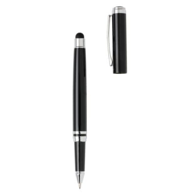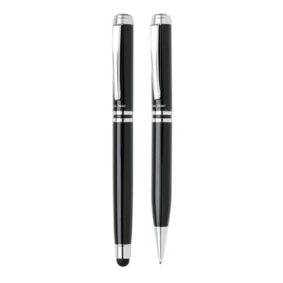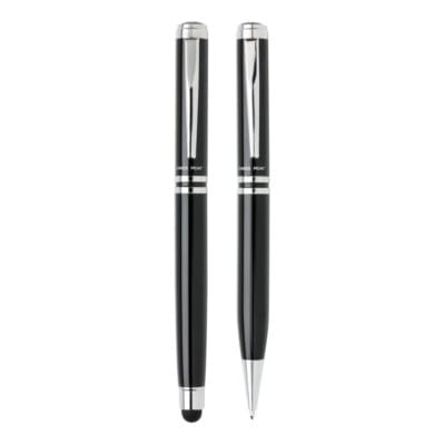 W skład zestawu wchodzi pióro kulkowe wykonane z mosiądzu, które zapewnia trwałość i elegancki wygląd, dodatkowo wyposażone w touch pen, umożliwiający wygodną obsługę urządzeń z ekranami dotykowymi. Towarzyszy mu długopis z niebieskim wkładem, ozdobiony subtelnym logotypem Swiss Peak, podkreślającym prestiż marki. Oba przybory piśmiennicze są starannie zaprojektowane, aby spełnić oczekiwania najbardziej wymagających użytkowników.
