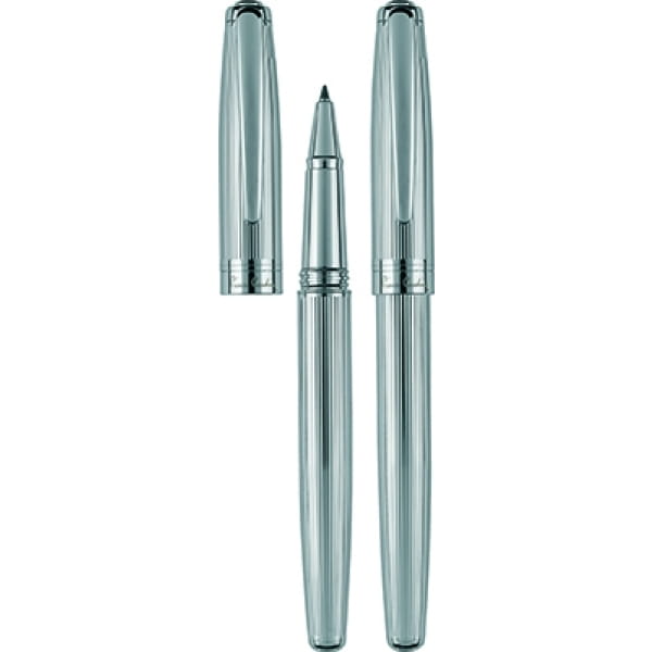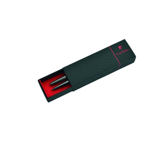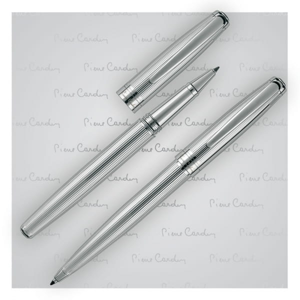 Precyzyjnie wykonany zestaw piśmienny o oryginalnym wzornictwie. W skład zestawu wchodzi długopis z wysokiej jakości wkładem oraz pióro kulkowe. Obydwa artykuły piszą na niebiesko. Długopis posiada zapasowy wkład w kolorze czarnym. Zapakowane w eleganckie pudełko prezentowe z certyfikatem autentyczności Pierre Cardin.