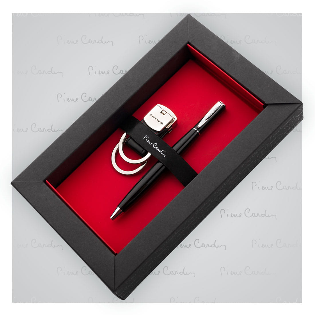 Zestaw upominkowy składający się z długopisu metalowego o niespotykanym kształcie korpusu oraz breloka do kluczy. Długopis wyposażony w wysokiej jakości niebieski wkład z końcówką 1 mm. Brelok metalowy, z dwoma rozpinanymi częściami (np. na klucze do domu i samochodu) oraz elementami ze skóry naturalnej. Całość zapakowana w eleganckie pudełko prezentowe z certyfikatem autentyczności Pierre Cardin.