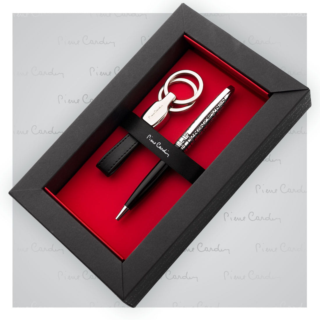 Luksusowy zestaw upominkowy składający się z długopisu metalowego JACQUES z niezwykłym, grawerowanym korpusem oraz breloka do kluczy. Długopis z mechanizmem obrotowym, wyposażony w wysokiej jakości niebieski wkład z końcówką 1 mm. Brelok metalowy, z dwoma rozpinanymi częściami (np. na klucze do domu i samochodu) oraz elementem ze skóry naturalnej. Całość zapakowana w eleganckie pudełko prezentowe z certyfikatem autentyczności Pierre Cardin.